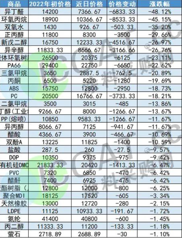 雙氧水目前報(bào)價(jià)926.67元/噸,較年初價(jià)格下跌503.33元/噸,跌幅35.20%;異辛醇目前報(bào)價(jià)8666.67元/噸,較年初價(jià)格下跌3166.66元/噸,跌幅26.76%;PA66目前報(bào)價(jià)22750元/噸,較年初價(jià)格下跌6650元/噸,跌幅22.62%;三氯甲烷目前報(bào)價(jià)2887.5元/噸,較年初價(jià)格下跌762.5元/噸,跌幅20.89%;丙酮目前報(bào)價(jià)5220元/噸,較年初價(jià)格下跌1280元/噸,跌幅19.69%;ABS目前報(bào)價(jià)12800元/噸,較年初價(jià)格下跌2950元/噸,跌幅18.73%;PC目前報(bào)價(jià)16766.67元/噸,較年初價(jià)格下跌3733.33元/噸,跌幅18.21%;PP(熔噴)目前報(bào)價(jià)9583.33元/噸,較年初價(jià)格下跌1266.67元/噸,跌幅11.67%。
