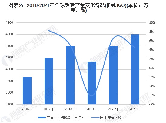 從全球鉀鹽總產量來看,2016-2021年全球鉀鹽產量整體呈現波動增長態勢。2021年,全球鉀鹽的礦產品產量達到4600萬噸(折純KO),同比2020年增長5%。