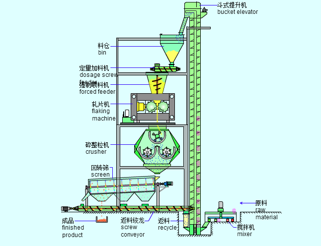 各種干粉物料從設(shè)備頂部加入,經(jīng)脫氣、螺旋預(yù)壓進(jìn)入兩個(gè)平等軋輥,軋輥相對(duì)旋轉(zhuǎn),物料被強(qiáng)制送入兩輥之間,軋輥將物料咬入輥隙進(jìn)行強(qiáng)制壓縮,物料通過(guò)壓縮區(qū)后,物料的表面張力和重力使之自然脫出。脫出后的指條狀團(tuán)塊進(jìn)入碎粒機(jī)由旋轉(zhuǎn)刀排破碎,被破碎的物料進(jìn)入整粒機(jī)通過(guò)滾動(dòng)刀排使顆粒和部分粉狀物料進(jìn)入旋振篩進(jìn)行篩分。合格品通過(guò)輸送機(jī)被送入成品倉(cāng)。粉狀篩下物料通過(guò)輸送機(jī)再次被送回原料倉(cāng)進(jìn)行二次輥壓,擠壓力的大小可根據(jù)造粒操作的需要由液壓系統(tǒng)進(jìn)行調(diào)節(jié)。 通過(guò)改變輥面開槽形式,可得到片狀、條狀、扁球狀等物料。