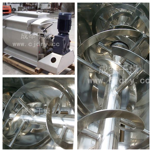 臥式螺帶混合機(jī)由U形殼體、螺帶攪拌放入葉片和傳動(dòng)部件組成;螺帶狀葉片為雙層內(nèi)外結(jié)構(gòu),外層螺旋將物料從兩側(cè)向中央?yún)R集,內(nèi)層螺旋將物料從中央向兩側(cè)輸送,形成對(duì)流混合。